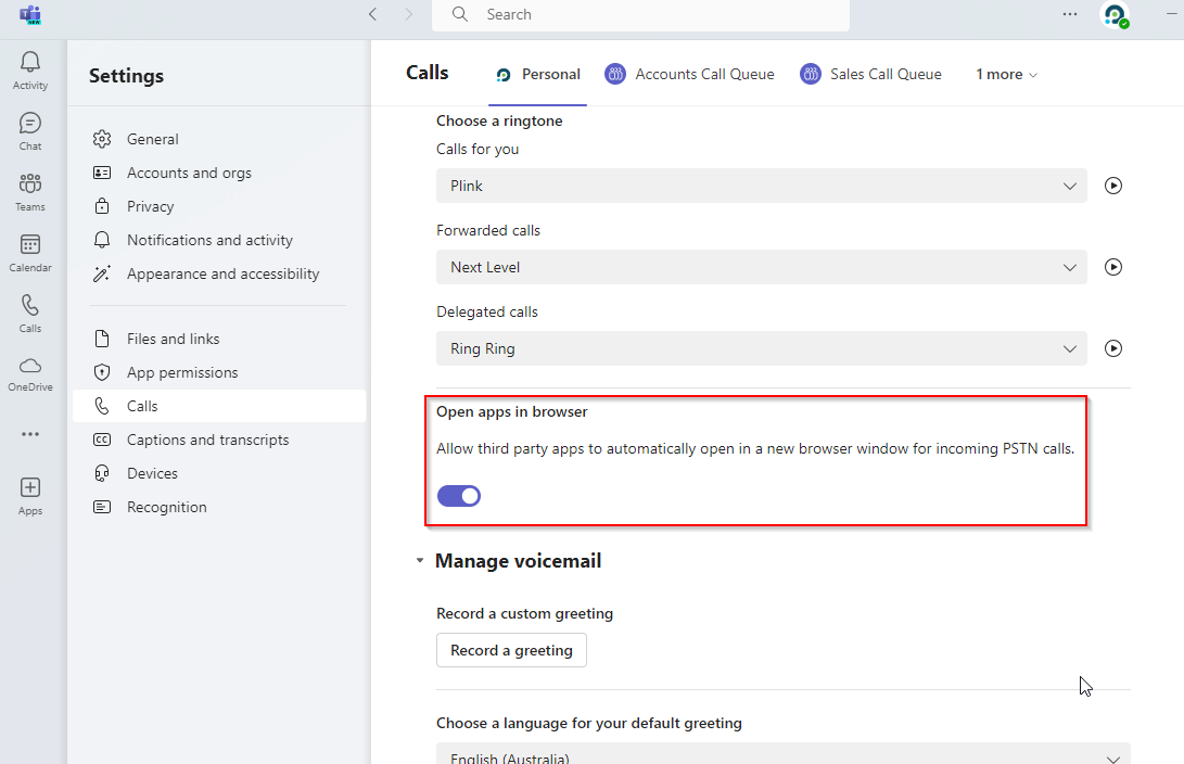 Enable 'Open Apps in browser for incoming PSTN calls'.